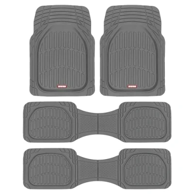 Built for Durability - Two thick heavy duty mats and two liners - flexible for floor contours, tough for all weather mats - built to last through rain, snow, mud and more; our advanced performance rubber polymers are tested for extreme temperature conditions to ensure they don't crack, split or deform. Deep Dish Design - The deep contours holds all your messes and liquids in place so nothing gets on your car. Maximum Weather Protection - Protect your vehicle's flooring by catching spills, stains, dirt and debris that other floor mats can miss. These mats are durable and long lasting and will withstand normal wear and tear. Custom Fit - Designed for compatibility and made to be trimmable to fit your vehicle’s floor contours and gas pedals with only a pair of scissors; Front Mats: 31. 5" L x 22. 5" W, Rear Liner: 58" L x 18" W. No-slip Grip - Rubberized nibs on the bottom and traction holds on top so the mat does not move and your foot stays in place.
