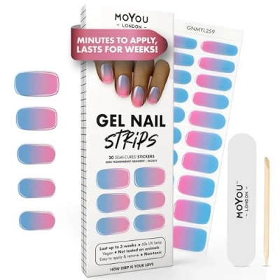 MOYOU LONDON Semi Cured Gel Nail Strips 20 Pcs. Wraps for Salon Quality Manicure Works with Any UV Lamp Easy to Apply, Trim, & Remove Stickers