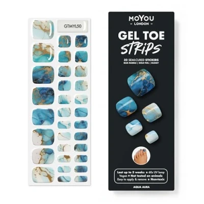 MOYOU LONDON Semi Cured Gel Nail Strips, 32 Pcs. Wraps, Easy Apply & Remove for Salon Quality Pedicure, Works with Any Lamps Aqua Aura