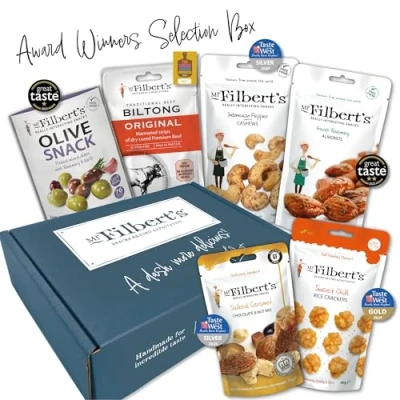 When only the best will do, choose Mr Filberts Award Winning Selection Box Containing the very best of our gourmet range of snacks, each one a gold-star champion Contains: Peanuts, Tree Nuts, Milk, Soy and Wheat MR FILBERT'S - Creator of gourmet snacks, using only the finest ingredients to ensure you're getting what nature intended 100% DELICIOUS - Enjoy as part of a healthy lifestyle