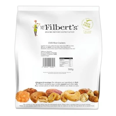 Deliciously spicy – seasoned with warm chillies for a bold, fiery flavour Crunchy texture – light rice crackers with an addictive crunch in every bite 500g sharing bag – perfect for family nights, parties, or stocking up at home Palm oil free – crafted with care using only the finest natural ingredients Mr Filbert’s quality – gourmet snack makers bringing you exciting flavours to enjoy anytime