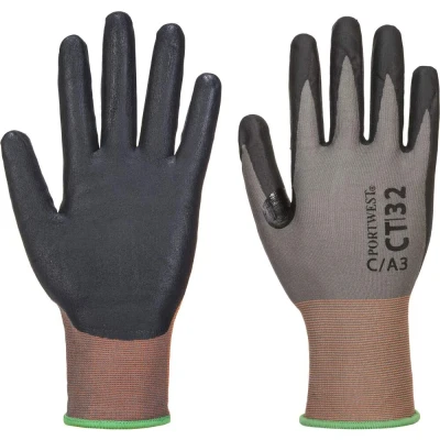 The Portwest CT MR18 Micro Foam Nitrile Cut Glove - Grey/Black is designed for individuals who demand not just protection but also unparalleled dexterity and comfort in their daily tasks. Created using 18-gauge breathable seamless liner technology, this glove promises an impeccable fit and feel. The glove's micro nitrile foam composition adds an additional layer of comfort, ensuring reduced hand fatigue even during prolonged usage. Making it an ideal pick for precision-oriented tasks in dry conditions, its Level C cut resistance ensures optimal safety.Key Features: Optimal Cut Resistance: With Level C cut resistance, it provides commendable protection against potential hazards. Enhanced Dexterity: The 18-gauge liner ensures users experience superior hand mobility. Safe Composition: Completely free from potentially harmful glass and steel fibres. Durable Design: Retains its cut performance even after 10 wash cycles. Reinforced Protection: Comes with a reinforced thumb crotch, increasing its durability and protection. Touchscreen Compatibility: Designed for the modern worker; compatible with touchscreen devices. Breathable Comfort: The seamless liner ensures optimal breathability, enhancing user comfort. ANSI Assurance: Meets the ANSI cut level A3, providing assurance of its protective quality.Compliance with Industry Standards: SATRA Technology Europe Ltd EN ISO 21420: 2020 Dexterity 5 EN 388: 2016 + A1: 2018 (4X31C) ANSI/ISEA 105: 2016 CUT Level (A3)The Portwest CT MR18 Micro Foam Nitrile Cut Glove - Grey/Black combines the latest in glove technology with safety standards, making it an excellent choice for professionals who need precision, protection, and comfort in one package.