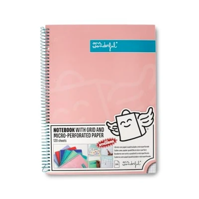 Mr. Wonderful A4 Pink Notebook 240 micro perforated squared pages Extra hard cover Spiral Binding Includes stickers