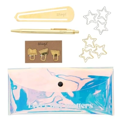 Kit to decorate your planner, notes or anything else. Consists of: 1 transparent pencil case, 1 blue ink pen, 3 paper clips, 4 bookmarks