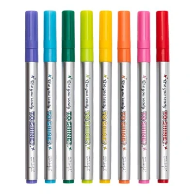 Set of 8 metallic ink markers. Ink colours: purple, blue, turquoise, green, yellow, orange, fuchsia and red. Directions for how to operate the markers: shake, press with the tip on the paper and write.