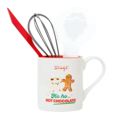 Gift set consisting of a ceramic cup, a whisk, a silicone spatula and a template to decorate with icing sugar. Mug features a funny Christmas message. In the same packaging we find a delicious recipe for making a hot chocolate. Cup capacity: 30 cl. Mug Directions: Microwave and dishwasher safe, although hand washing is recommended so that the design stays intact longer. Instructions for utensils: dishwasher-safe.