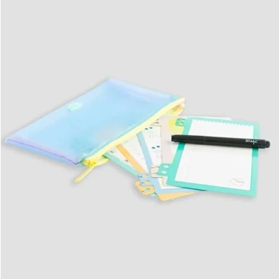 Kit to decorate the agenda, notes or anything else. It is composed of: 6 Set of cardboard sheets lined with white slate to fit the spiral of binding diaries or notebooks Includes fine scary marker 100% Polyester Case