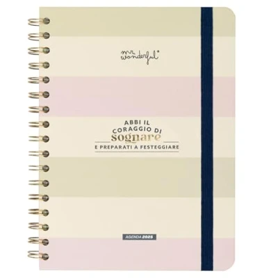Mr. Wonderful Office Diary is a kind of design that is a little more restrained and measured than our more classic style, so it will appeal to a more adult audience. Weekly organisation runs from January to December 2025. This diary contains: 160 pages of FSC certified 100g paper / Motivational daily phrases / dividers with tab / inner cardboard pocket / plastic inner ruler/8 sheets of stickers Schedules and calendars for 2025 and 2026 / exclusive playlist / pages for marking contacts / savings charts / elastic closure / monthly planner at the beginning of each month / sticky notes with different shapes / super motivational monthly phrases