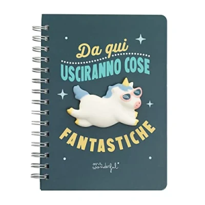 A5 size notebook spiral binding Contains a Mr. Wonderful unicorn on the cover. This unicorn is made of memory foam, stress reliever type. It has 160 blank pages inside and a sheet of stickers. Material: FSC paper, which ensures that it was made from paper from environmentally responsible forests
