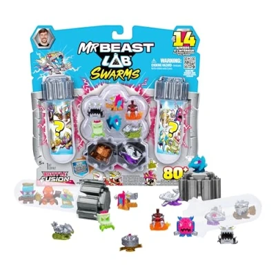 MrBeast Lab Swarms Battle Fusion Series Mega Pack Includes 14 Micro Beasts with Ultra Rare Hammerhead, 80+ to Collect, Stickers & Stackable Caps for Display