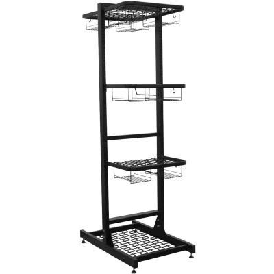 General description Steel construction powder paint coated for added corrosion resistance. This freestanding motorcycle helmet and gear storage unit is designed to organize the storage of gloves, clothing, boots, and helmets. It allows for easy storage of four or more helmets and can be configured to accommodate one-piece race leathers on one side while providing three shelves on the other. Technical specifications Material: Steel Powder coated for corrosion resistance Shelf capacity: 18kg Hanging rack capacity: 10kg Usage Organizes storage for gloves, clothing, boots, and helmets Stores two full sets of kit and more