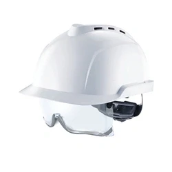 Balanced. modern. low-profile vented helmet with integrated eye protection .6-point Fas-Trac® III ratchet suspension. integrated over spectacles with intelligent adjustment and innovative rubber seal. For use where top impact hazards to the head.