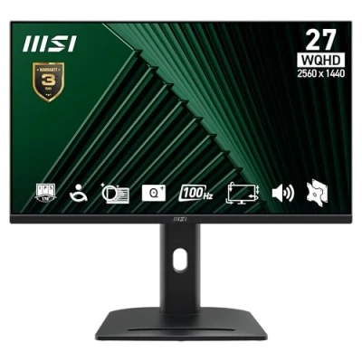 27-INCH WQHD PANEL - The PRO MP275QPG features a 27-inch IPS panel (178° wide viewing angle) with WQHD (2560 x 1440) resolution; A high 100Hz refresh rate (1ms MPRT) improves the day-to-day visual experience with smoother, faster frame rates IMAGE QUALITY - The PRO MP275QPG supports a superior 100% sRGB colour gamut (8-bit+FRC, 16.7M colours), 300 nits brightness & high 1300:1 contrast ratio; MSI Display Kit App unlocks extra display, productivity & colour settings LESS BLUE LIGHT - TÜV Rheinland Eye Comfort certified features include Less Blue Light filters & Anti-Flicker technology; Employs anti-glare surface treatment, default eco-mode settings, and Eye-Q Check functionality (via OSD menu) SIMPLE YET FLEXIBLE - The monitor comes with 100mm VESA brackets for wall or arm mounting (e.g., MSI VESA Arm MT81), while the stand is 4-way adjustable ergonomic stand MULTIPLE CONNECTIVITY - Supports triple sources with HDMI 2.0b (2560x1440/100Hz, HDMI-CEC for consoles) & DisplayPort 1.2a ports, Adaptive Sync supported; Includes Kensington Lock