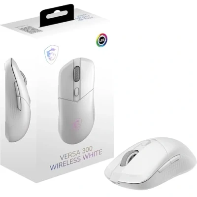 50 HOURS GAMEPLAY PER CHARGE - The lightweight mouse (60g) offers up to 50 hours of gameplay with a full charge; Features durable Kailh Micro switches (30m+ clicks) 8000 DPI & 1 MS LATENCY - PixArt PAW3104 Optical Sensor with 8 selectable DPI levels (400 / 800 / 1600 / 2400 / 3200 / 4000 / 6400 / 8000) SYMMETRICAL & SLIM DESIGN - A symmetrical form is suitable for either left or right-handed users; Diamond-patterned anti-slip grips and Pure PTFE skates help improve handling RGB Lighting - An illuminated MSI Dragon logo displays a number of colors & predefined lighting effects that can be conveniently cycled through using a dedicated button WIRELESS CONNECTIVITY - The VERSA 300 WIRELESS WHITE employs the latest 2.4 GHz RF wireless for minimal latency. While also including Bluetooth 5.3 technology and a 2-meter FriXionFree (USB-C to A) cable.