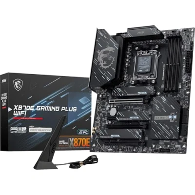 ULTRA POWER - SUPPORTS THE LATEST RYZEN 9000 PROCESSORS IN HIGH PERFORMANCE - The X870E GAMING PLUS WIFI employs a 14 Duet Rail Power System (60A, SPS) VRM for the AMD X870E chipset (AM5, Ryzen 9000 / 8000 / 7000) with Core Boost architecture FROZR GUARD - Excellent cooling features such as 7W/mK MOSFET thermal pads, extra choke thermal pads and an Extended Heatsink; Includes chipset heatsink, EZ M.2 Shield Frozr II, a Combo-fan (for pump & system) header (3A) DDR5 MEMORY, PCIe 5.0 x16 SLOT - 4 x DDR5 DIMM SMT slots enable extreme memory overclocking speeds (1DPC 1R, 8200+ MT/s OC); 1 x PCIe 5.0 x16 SMT slot (128GB/s) with Steel Armor supports cutting-edge graphics cards TRIPLE M.2 CONNECTORS - Storage options include 1 x M.2 Gen5 x4 128Gbps slot with EZ M.2 Shield Frozr II to prevent thermal throttling, 2 x M.2 Gen4 x4 64Gbps slots ULTRA CONNECT - Network hardware includes a full-speed Wi-Fi 7 module with Bluetooth 5.4 & 5Gbps LAN; Rear ports include USB4 Type-C 40Gbps with display output and 7.1 HD Audio with Audio Boost