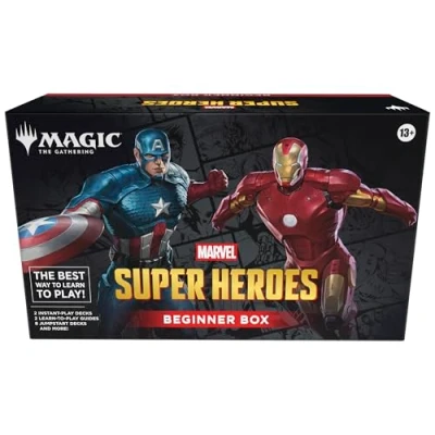 ANYONE CAN BE A HERO—Your Magic: The Gathering journey begins with a friend beside you! Play your very first game in a guided battle of Captain America versus Iron Man. Choose your side and send your forces into the fight while learning essential gameplay lessons GUIDED LEARN-TO-PLAY EXPERIENCE—Start by playing a tutorial game with two 20-card decks, each with a step-by-step guide booklet that will walk you through your first game CREATE THEMED DECKS—Once you’ve conquered the basics, realize your true potential by combining any two of the eight 20-card half-decks into a full 40-card Marvel Super Heroes-themed deck; mix and match to try different combos! EVERYTHING YOU NEED TO PLAY—This Beginner Box includes everything you and a friend need to play, including 2 Playboards that will show you where to place your cards, 2 Spindowns to track your life totals, and 1 Rules Reference booklet to answer any questions you have along the way WELCOME TO THE GATHERING—Magic: The Gathering is a collectible card game that weaves deep strategy, gorgeous art, fantastical stories, and a thriving fan community all together into a card game experience like no other TOTAL OF 200 MARVEL SUPER HEROES-THEMED CARDS—Contains 2 packets of 100 cards, including two 20-card tutorial decks (Captain America and Iron Man) and eight 20-card half-decks PLAY ACCESSORIES INCLUDED—2 Playboards, 2 Spindown Life Counters, 2 Learn-to-Play Guides, 5 double-sided tokens, 1 Rules Reference booklet, Manufacturer: Wizards of the Coast