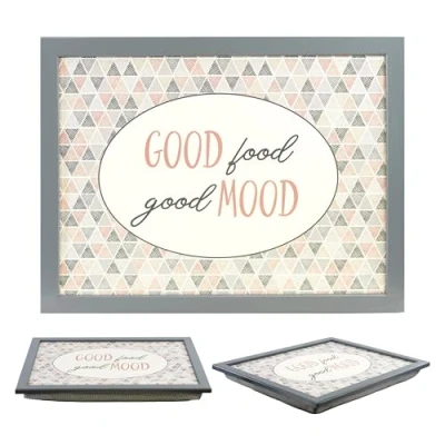 VERSATILE AND COMFORTABLE: Perfect for enjoying meals, snacks, or breakfast in bed, this lap tray is also great for working, studying, or doing arts and crafts from the comfort of your sofa or bed. STYLISH DESIGN: Featuring a chic "Good Food, Good Mood" message surrounded by a trendy triangle pattern, this lap tray with cushion adds a modern touch to your daily activities. IDEAL FOR TV, WORK, AND STUDYING: Use this lap tray for dinner while watching TV, as a laptop bed table for remote work, or to keep your food secure while relaxing. FANTASTIC GIFT FOR FOOD ENTHUSIASTS: Ideal for those who appreciate both style and good food, this breakfast tray makes a thoughtful gift, combining functionality with a positive message. Specifications: Packaging Dimensions: Height 34cm, Depth 5cm, Width 44cm, Weight 575gm / Item Dimensions: Height 5cm, Depth 44cm, Width 34cm / Brand: MTS / Material: Wood