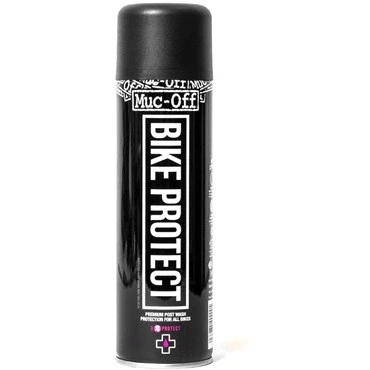 Bike Protect is the ultimate liquid bicycle protection. Preserve and freshen your bike with Bike Protect’s incredible water dispersing action! It’s a perfect ‘all over’, after-wash corrosion inhibitor due to its extremely high oil content. This increased oil content creates the finest bike protection spray on the market. It drives out moisture and leaves a sparkling, non-sticky protective layer on your frame, drive chain, metal parts and paintwork. It’s ideal to spray onto your chain to drive out moisture before you apply any of our brilliant Muc-Off chain lubes. Bike Protect doesn’t just disperse water after you’ve given your bike a good clean. It also prevents dirt adhesion between washes and reduces future maintenance time as well as helping reduce friction, wear and energy consumption.*Just remember not to apply Bike Protect to your tyre treads and braking surfaces!Key Features:High performance formula leaves dry, non-sticky protective filmSafe on frame, metal parts, plastics, rubber, paint and carbon fibreDrives out excess moisturePrevents dirt adhesionLight lubricant coats moving partsQuick and easy to use500ml Aerosol SprayDirections for Use:Step 1 - After washing your bike with Muc-Off Nano Tech Bike Cleaner, apply Bike Protect to disperse remaining moisture.Step 2 - Wipe away any excess fluid and leave to dry.