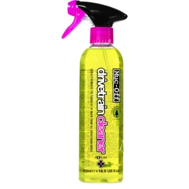 The Muc-Off Bio Drivetrain Cleaner is the complete drivetrain cleaning solution that can either be poured into a chain cleaning device or sprayed directly to your chain rings, rear cassettes and derailleurs to clean your entire drivetrain within seconds. It’s also fully biodegradable and safe for metal, plastic, rubber and seals. You have never seen results like this. We can guarantee it! Why not try using Bio Drivetrain Cleaner with the Muc-Off X-3 Dirty Chain Machine to provide the deepest clean on even the dirtiest chains!Key Features:Fast and effective grease cutting formulaRemoves all chain oil and wax residueSafely eliminates drive chain contaminantsBiodegradableIdeal for use with chain cleaning devicesTrigger spray included for easy applicationDeep cleans all drive chain areas in secondsDirections for UseStep 1 - Shake bottle to activate formula.Step 2 - Spray Bio Drivetrain Cleaner over the entire drive chain area including cassette, chain rings, chain and derailleurs.Step 3 - Leave for up to 2 minutes before agitating stubborn grease, oil or grime with a brush or cloth. If using with a Muc-Off X-3 Dirty Chain Machine, unscrew trigger spray and fill device with formula. Attach the device to chain and spin pedals in reverse motion for 4-6 revolutions.Step 4 - Rinse with fresh, clean water to remove all contaminants.Step 5 - After rinsing, apply Muc-Off Bike Protect and a Muc-Off Chain Lube for ultimate drive chain efficiency!