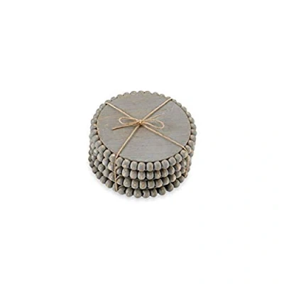 Set of four washed mango wood coasters feature beaded rims and arrive stacked and bound with twine. Size: 4 3/4" dia Number of pieces: 1.0 Package Dimensions: 8.255 L x 16.51 H x 13.97 W (centimeters)