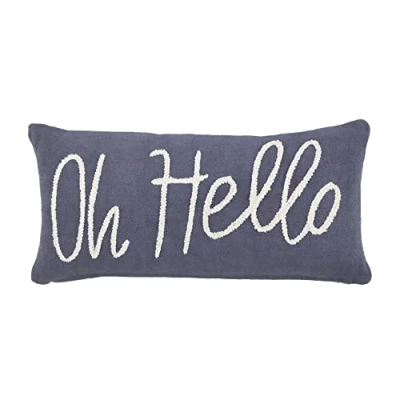 Our Hello Lumbar Dhurrie Pillow is the perfect finishing touch for your home! The pillow reads "Oh Hello" in white cursive writing The Embroidered dhurrie cotton lumbar pillow features a zipper closure and has jute backing Measures 25"x12"