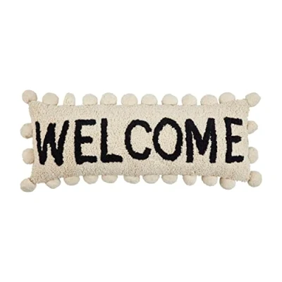 Make your house a home with our Tufted Long Pillow! This tufted long pillow features black pom pom trim along the border. The pillow features a canvas backing along with a zipper clouse. The pillow reads " Welcome" in black tufted text. Measures 11" x 35"