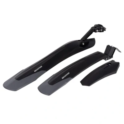 MTN Range: Offering protection for when the going gets rough. Available as individual suspension fork fitting front or seat post fit rear or as a set. XL rear version is available for extra mud protection. Includes: Set of off-road mudguards for front and rear wheels, suitable for 26", 27.5" and 29" diameter wheel. Max tyre width: 2.5". Front: Fork mounted, compatible with all popular suspension forks with fender length of 580mm. Rear: Seat-post fitting with fender length of 555mm. Design: Flexible soft-tail and quick-release bracket for easy fitting and removal.
