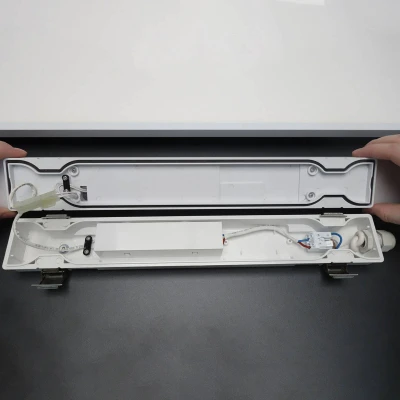 LED moisture-proof luminaire Aquafix for cellars, workshops and outdoorsThe LED moisture-proof luminaire Aquafix is suitable for illuminating cellars, garages, workshops and also for outdoor use. It impresses with a revolutionised, particularly simple installation with a separate connection box and housing parts that can be separated and clicked together again. The luminaire can be installed by one person. The moisture-proof luminaire is prepared for through-wiring with internal cable duct, 2-fold luster terminal, predetermined breaking point and enclosed clamps for cable fixing, so that it can be mounted as a seamless strip light. - Light colour universal white (4,000 K)