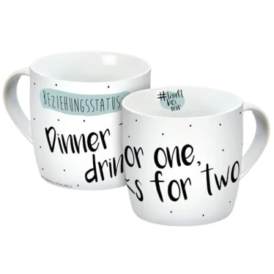 The dinner for one mug signals with the saying "Relationship status: Dinner for one, drinks for two" that you are not looking for a relationship. The porcelain mug is intended for freshly become singles, permanent singles or those who simply have no buck on relationship. There are moments in life, when you are happier and more satisfied with yourself. The mug is dishwasher and microwave safe. Product details: material: porcelain. Contents: approx. 300 ml. Height: approx. 8.5 cm, diameter approx. 8.5 cm | With printed cardboard packaging | Microwave safe | Dishwasher safe | The item includes only one cup.