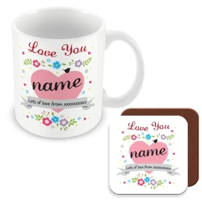 MUGGZ Personalised Mug & Coaster with Name Nanna Love Heart Flowers Design Cup Giftset Made in The UK