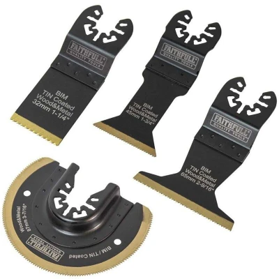 General description The Faithfull Multi-Function Titanium Blade Set includes four high-performance bi-metal blades coated with durable titanium to enhance cutting efficiency and extend lifespan. These blades are suitable for various cutting tasks in woodworking, metalworking, and plastics. Technical specifications Set includes 4 blades: 32mm Universal Blade 45mm Flexible Flush Cut Blade 65mm Flush Cut Blade 87mm Radial Saw Blade Blade materials: Bi-metal with titanium coating for increased durability Compatibility and accessories Compatible with many multi-function oscillating power tools Installation Insert the blade into the tool's compatible oscillating attachment mechanism Ensure the blade is securely fitted before use Usage Use the appropriate blade for the material and cut type Operate the tool at recommended speeds and follow safety instructions Other information