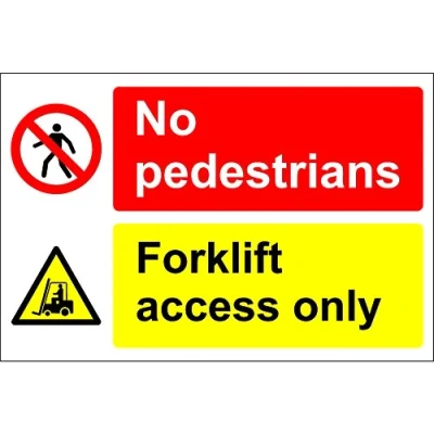 Multi-purpose signs No pedestrians forklift access only general safety sign Self adhesive sticker 300mm x 200mm Remove backing film and apply to dry, smooth, oil free surface. Digitally printed and laminated for extra durabillity