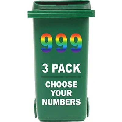 MULTICOLOURED 3-PACK – You’ll receive 1 set of 3 multicoloured bin numbers for wheelie bins, designed to help you easily identify your bins and prevent mix-ups with your neighbours. CLEAR & VISIBLE DESIGN – Each wheelie bin sticker measures 18cm (7") tall, making your wheelie bin numbers bold, legible, and easy to spot from a distance. HIGH-QUALITY VINYL – These bin stickers for wheelie bins are made from premium, weather-resistant vinyl that stands up to rain, sun, wind, and time. PEEL & APPLY – Our number stickers for wheelie bins are quick and easy to use. Just peel from the backing and stick directly onto your clean bin surface—no fuss, no tools required. DURABLE & LONG-LASTING – Designed to last for years, these bin number stickers, bin stickers, and number stickers stay firmly in place through all weather conditions