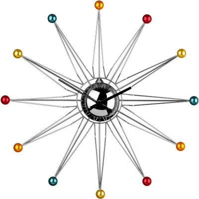General description If you're a huge fan of modern wall clocks, then Premier Housewares has got your back! This amazing wall clock combines functionality and style, providing a contemporary piece that will complement any room in your home. The design features silver spikes with multicolored round beads at the ends, adding a contemporary look. The numbers are written in Roman numerals, enhancing the modern aesthetic of this large wall clock. Technical specifications Dimensions: 50 cm x 50 cm x 5 cm (height x width x depth) Material: Durable metal Usage Hang it in your bedroom for a modern look Perfect for your living room, as it complements most decors Ideal for hanging in your hallway