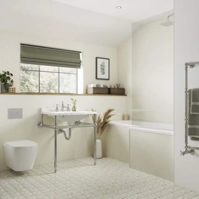 The Multipanel Contemporary Senora Stone Unlipped Shower Wall Panel adds elegance to your bathroom. With a soft white base and grey terrazzo accents, it suits neutral and pastel tones, as well as natural wood and stone decor. This fully waterproof panel offers a natural stone look without the high cost. The 11mm thick panels are lightweight, easy to install, and can be placed over old tiles, saving time and money. Unlipped edges allow versatile fitting without grout. Made from FSC-certified Medite MDF, they're 100% recyclable and eco-friendly. Cleaning is simple with a wipe-clean surface. Enjoy peace of mind with a 30-year warranty. Panels must be stored flat and conditioned for 48 hours before installation. Use Multipanel High Grab Adhesive and ensure all edges are silicone-sealed for watertight results. Avoid scouring products to maintain the warranty. The dimensions are 2400mm x 598mm.. Multipanel Contemporary Senora Stone Unlipped Shower Wall Panel - 2400mm x 598mm Laminated MDF