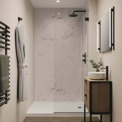 The Multipanel Linda Barker Graphite Elements Unlipped Shower Wall Panel is a modern addition for bathroom or wet room renovations. It features a waterproof Onyx Marble design, providing luxury without high costs. Its light tone and dark grey veining offer a chic, high-end finish. Designed by Linda Barker, it's part of a collection inspired by wood, metal, and stone. The unlipped bare edge offers versatile fitting, eliminating the need for grout. It is 11mm thick, installable over tiles, 100% recyclable, and FSC-certified with a 30-year warranty. Store panels flat and condition them before installation. Use Multipanel adhesive and sealant for warranty validity. Apply silicone at edges for a watertight seal and use offcuts for a coordinated look. Clean with warm water and mild detergent only. Scouring products may void the warranty. Panel size is 2400mm x 900mm.. Multipanel Linda Barker Onyx Marble Unlipped Shower Wall Panel - 2400mm x 900mm Laminated MDF