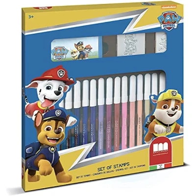 Multiprint Set 2 Stamps for Kids and 18 Coloured Pens Paw Patrol Boys, Made in Italy, Children, Wood Natural Rubber, Non toxic Washable Ink, Gift Idea, art.86903