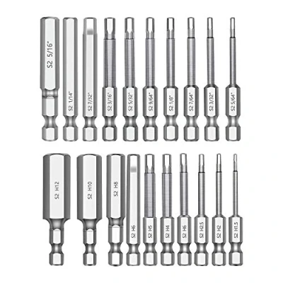 WELL-EQUIPPED BITS SIZE - 20 piece hex driver/ allen drill precise bits in the following size: 10 PC SAE of 5/64", 3/32", 7/64", 1/8", 9/64", 5/32", 3/16", 7/32", 1/4", 5/16" and 10 PC Metric of 1.5mm, 2mm, 2.5mm, 3mm, 4mm, 5mm, 6mm, 8mm, 10mm, 12mm INDUSTRIAL GRADE QUALITY - The hex drill bits are made from S2 steel material in a matt rust-resistant finish with labeled size marks & magnetic tips. Two portable rubble strips store in a durable plastic case: one packs bits in SAE, another packs bits in Metric EXPERIMENT TESTS - The bits have experienced torsion and hardness test. The results of tests show that the maximum torsion force of bits are 180-200N and the hardness of bits are 57-59HRC. The high torsion and proper hardness avoid the bits break and wear USAGE VERSATILITY - 1/4 inch quick release hex shank driver bits fit for electric screwdriver, hand screwdriver, electric drills & air drills. Ideal for working on vehicles, bicycles & furniture. Assembling/repairing your furniture in an easy way CONVENIENT STORAGE & PORTABILITY - Comes with two portable rubber strips that securely hold the bits in place, packed in a durable plastic case for easy organization and transport. Keep your hex bits easily accessible whether you're at home, in the workshop, or on the go