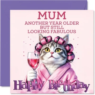 MAKE YOUR MUM SMILE WITH THIS UNIQUE BIRTHDAY CARD: This exceptional quality Mum birthday card for her shows the design 'Mum Another Year Older But Still Looking Fabulous Happy Birthday'. If you are looking for a beautiful birthday card Mum for her, then then this happy birthday Mum card is bound to make her smile. Not just a birthday card for Mum this could also be a birthday gifts for Mum, Mummy or Mother. WHAT DO YOU GET: The card is printed on one side and BLANK ON THE INSIDE to allow you to write your very own message. The unique fun design is printed on a specially sourced and environmentally responsible board. At 360 microns thick the natural white one-sided gloss board has a quality look and feel. Supplied with a coloured gummed envelope to complement the design and ready to be sealed and sent in the post. Great Mum birthday cards, Mummy birthday card. NO INK SMUDGES: There is nothing worse than writing inside a card to find that the shiny surface makes the ink smudge. This is why we use a high quality one sided coated board. The uncoated side will absorb more of the ink from your pen to make smudging a thing of the past. Mum birthday cards, Mum birthday cards from Son. SIZES: Greeting Card = 145mm x 145mm, Envelope = 155mm x 155mm, Card Thickness = 360 micron. Happy birthday Mum, Mums birthday card, Mum cards birthday, birthday card Mum, happy birthday Mum card, Mum gifts from Son. MADE AND QUALITY CHECKED IN THE UK: We print and manufacture all our products right here in the UK so you can be sure of a fast turnaround and a product that is expertly made. Using environmentally responsible premium board our card is conscious of the responsible management of the world's forests - happy birthday card Mum, Mum birthday cards.