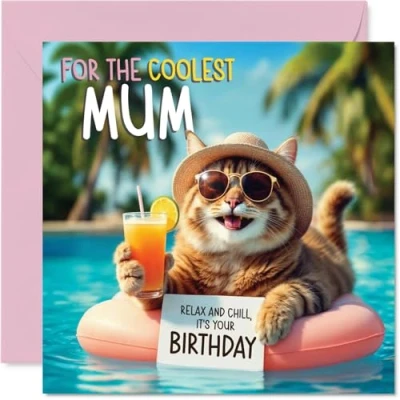 MAKE YOUR MUM SMILE WITH THIS UNIQUE BIRTHDAY CARD: This exceptional quality Mum birthday card shows the design 'For the coolest Mum Relax and Chill its your Birthday'. If you are looking for an awesome birthday card for Mum, then then this happy birthday Mum card is bound to make them smile. Not just a birthday card for Mum this could also be a birthday gifts for Mum, Mummy or Mother. WHAT DO YOU GET: The cards are printed on both sides with the inside print saying 'Have a Great Day' and ample space for your own personal message. The unique fun design is printed on a specially sourced and environmentally responsible board. At 360 microns thick the natural white one-sided gloss board has a quality look and feel. Supplied with a coloured gummed envelope to complement the design and ready to be sealed and sent in the post. NO INK SMUDGES: There is nothing worse than writing inside a card to find that the shiny surface makes the ink smudge. This is why we use a high quality one sided coated board. The uncoated side will absorb more of the ink from your pen to make smudging a thing of the past. Mum birthday cards, Mum birthday cards from Son. SIZES: Greeting Card = 145mm x 145mm, Envelope = 155mm x 155mm, Card Thickness = 360 micron. Happy birthday Mum, Mums birthday card, Mum cards birthday, birthday card Mum, happy birthday Mum card, Mum gifts from Son. MADE AND QUALITY CHECKED IN THE UK: We print and manufacture all our products right here in the UK so you can be sure of a fast turnaround and a product that is expertly made. Using environmentally responsible premium board our card is conscious of the responsible management of the world's forests - happy birthday card Mum, Mum birthday cards.
