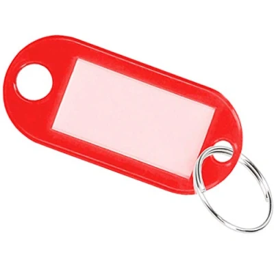 Key tags with key ring in red With pre-assembled key ring and interchangeable labelling field with transparent protective cover Key ring size: approx. 50.0 mm x 22.0 mm Key rings: approx. 16 mm outer diameter in silver Labelling area: approx. 30.0 mm x 15.0 mm
