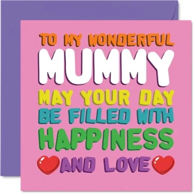MAKE YOUR MUMMY SMILE WITH THIS UNIQUE BIRTHDAY CARD: This exceptional quality Mummy birthday card for her shows the design 'To my wonderful Mummy may your day be filled with happiness and love'. If you are looking for a beautiful birthday card Mummy for her, then then this happy birthday Mummy card is bound to make her smile. Not just a birthday card for Mummy this could also be a birthday gifts for Mummy, Mum or Mother. WHAT DO YOU GET: The cards are printed on both sides with the inside print saying 'Have a Great Day' and ample space for your own personal message. The unique fun design is printed on a specially sourced and environmentally responsible board. At 360 microns thick the natural white one-sided gloss board has a quality look and feel. Supplied with a coloured gummed envelope to complement the design and ready to be sealed and sent in the post. NO INK SMUDGES: There is nothing worse than writing inside a card to find that the shiny surface makes the ink smudge. This is why we use a high quality one sided coated board. The uncoated side will absorb more of the ink from your pen to make smudging a thing of the past. Mummy birthday cards, Mummy birthday cards from Son. SIZES: Greeting Card = 145mm x 145mm, Envelope = 155mm x 155mm, Card Thickness = 360 micron. Happy birthday Mummy, Mummys birthday card, Mummy cards birthday, birthday card Mummy, happy birthday Mummy card, Mummy gifts from Son. MADE AND QUALITY CHECKED IN THE UK: We print and manufacture all our products right here in the UK so you can be sure of a fast turnaround and a product that is expertly made. Using environmentally responsible premium board our card is conscious of the responsible management of the world's forests - happy birthday card Mummy, Mummy birthday cards.