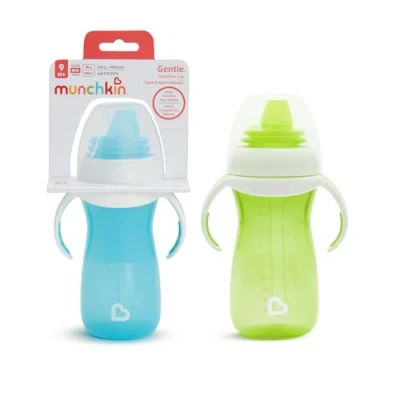 MUNCHKIN TODDLER SIPPY CUP SET: Set of 2 green and blue toddler and baby drinking cups with 10oz/296ml capacity. Each baby cup with spout and lid is perfectly sized for little hands. Bye, bottles! NON SPILL CUP: This Munchkin sippy cup for toddlers and babies over 4 months has a soft spout, perfect for moving on from bottle feeding or breastfeeding. Our cute baby sippy cup is an ideal first cup STRONG SILICONE CUPS WITH REMOVABLE HANDLES: The Munchkin cup has removable handles to help support your baby's development and aid the transition from bottle to Munchkin toddler cup EASY TO CLEAN BEAKER: Munchkin straw cups, sipping cups and bottles are top shelf dishwasher safe and are a great gift for a boy or girl. The removable lid for on-the-go is easy to clean PART OF THE MUNCHKIN BABY WEANING RANGE: Innovative baby sippy cups, toddler feeding accessories, baby weaning sets and kids cups - all designed with your little one in mind