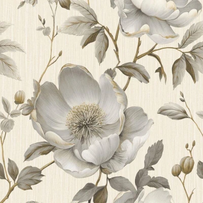 General description This elegant wallpaper design presents a sophisticated and timeless floral motif, showcasing large, beautifully rendered blossoms and intertwining botanical elements against a subtly textured, creamy off-white background. The palette is intentionally muted, focusing on a graceful interplay of soft greys, delicate beiges, and subtle brown tones, creating an atmosphere of refined tranquility. The prominent flowers, reminiscent of lush peonies or magnolias, are depicted with incredible detail, their petals unfurling in shades of light grey and taupe, some with hints of a warm, sandy undertone. Complementing these magnificent blossoms are slender branches and an abundance of leaves, all rendered in varying shades of muted brown, beige, and a soft, desaturated green. The overall impression is one of classic elegance and understated luxury, making it an ideal choice for creating a serene and inviting ambiance in a variety of interior settings. Technical specifications