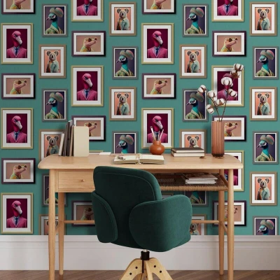 Transform your living space with the striking Fantastic Animals wallpaper, a delightful fusion of quirky and contemporary design that brings character and vibrancy to any room. Featuring an eclectic mix of fun animals, such as a cool chameleon, a stylish peacock, a gorgeous gecko, and a well-dressed flamingo, this wallpaper is sure to make a bold statement. The lively colourful tones are beautifully contrasted against a rich teal background, creating a playful gallery wall effect that is both eye-catching and unique.
