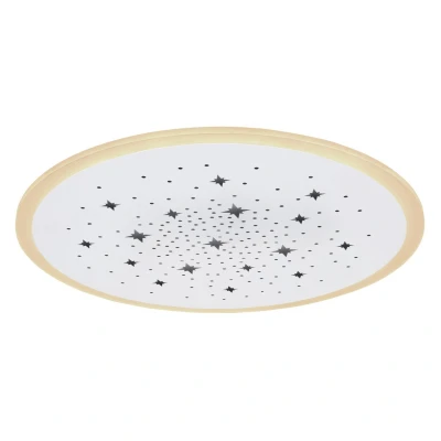 This round ceiling lamp of the Murphy series (ø 50 cm) is wonderful for your interiors. It consists of a plastic ring that encloses the round, white metal plate, which is provided with star-shaped and round punches. These can be illuminated in RGB colors. With the included LED bulbs, the ceiling lamp provides 2400 lumens of strong light. In addition, you can not only dim them with the help of the supplied remote control, but also individually adjust the light color in several levels between 2700 Kelvin (warm white) and 6500 Kelvin (cold white) and also have a night light function. With other models of the same series you can complete the overall picture in your four walls. Product features: Ceiling light metal white, plastic white, dimmable, many steps wall switch, color fixing, rgb colour change, rgb colour fixing, memory function, night light, remote control, battery included 2x aaa, ø: 500mm, h: 50mm, incl. led 30w 230v, 410-3000lm source, 290-2400lm output, cct 2700-6500k, incl.
