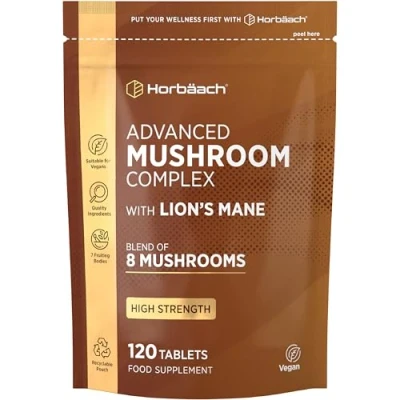 ADVANCED 8 MUSHROOM COMPLEX: Powerful Complex with a blend of 8 Mushrooms, delivering a high strength of 1200mg per daily serving. SUPER BLEND: Formulated with Lion's Mane, Reishi, Chaga, Shiitake, Maitake, Cordyceps, Shaggy Mane and Oyster. NATURAL HEALTH BOOSTER: Mushrooms are a rich source of Fibre, Protein & Vitamins. SUITABLE FOR: Horbaach Mushroom Complex capsules are vegan and are free from artificial colours, flavours, or preservatives. It's the perfect formula for adult men and women at the best value. PACKAGING MAY VARY: We are in the process of updating our packaging. If the product you receive appears different, please rest assured that the benefits remain the same.