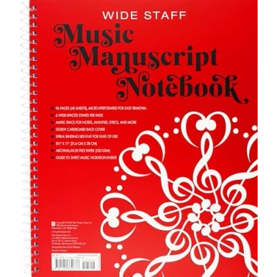 Wide-staff Music Manuscript Notebook has 6 wide-spaced staves per page. Perfect for youngsters, adults who prefer wider-spaced staves, and students needing ample space for notes and analysis. 48 sheets (96 pages). Each sheet is micro-perforated for easy removal. Thick 120 gsm pages support pencil or pen. Paper is acid free and of archival quality. Guide to sheet music notation inside. Durable wire-o binding lies flat for ease of use. Sturdy cardboard back cover. Notebook measures 8-1/2'' wide x 11'' high.