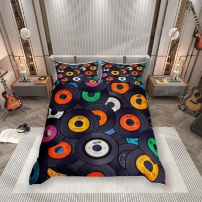 Musical Theme Duvet Cover Set (No Comforter) Colroful Vinyl Records Decor Bedding for Kids Girls Teens Comforter with Zipper Ties (1 + 2 Pillow Cases) King Size