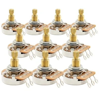 Fits most imported or Asia made electric guitars and basses Coarse 18-spline split shaft diameter: 6mm (15/64 inch), Metric sized M8 thread, 8mm in diameter, thread height: 9.5mm (3/8 inch) Full brass made shaft and thread, better conductivity Audio taper, resistance: 250K, tolerance: 20%, usually used for single coil pickups, bleeds off some of the high frequencies to ground, gives warmer tone than 500K Package includes: 10 pieces pots with mounting accessories